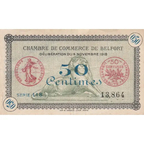 CHAMBRE DE COMMERCE DE BELFORT DÉLIBÉRATION DU 4 NOVEMBRE 1918 50 CENTIMES SERIE IMP.B.ARNAUD-LYON-PARIS |