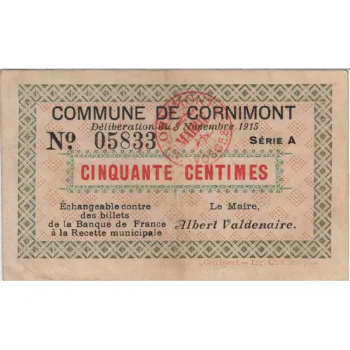 | Obverse lettering | COMMUNE DE CORNIMONT délibération du 8 Novembre 1915 N°05833 Série A CINQUANTE CENTIMES Echangeable contre des billets de la Banque de France à la recette municipale. Le Maire Albert Valdenaire. Cornimont - Imp. Ch. Girompaire |