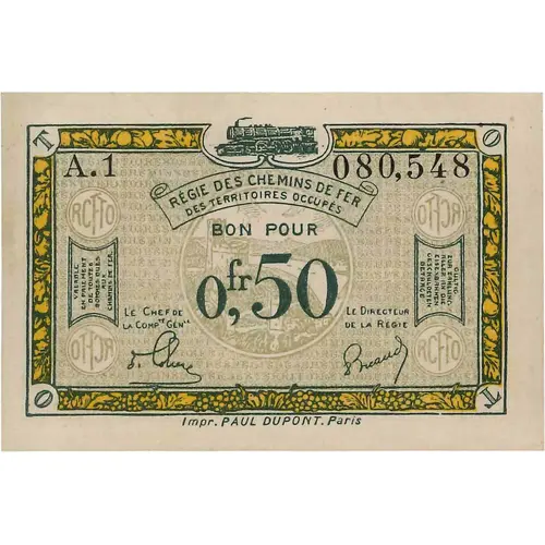 REGIE DES CHEMINS DE FER DES TERRITOIRES OCCUPES BON POUR 0fr,50 RCFTO | OTFCR VALABLE EN PAIEMENT DE TOUTES SOMMES DUES AUX CHEMINS DE FER OUTLIG ZUR ZAMLUNG ALLER AN DIE EISENBAHNTEN GESCHULDETEN BETRACE RCFTO | OTFCR Impr. PAUL DUPONT. PARIS |