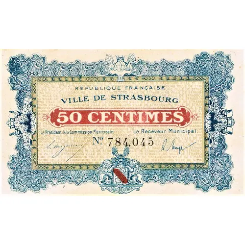 Leyenda del anverso REPUBLIQUE FRANCAISE VILLE DE STRASBOURG 50 CENTIMES Le Président de la Commission Municipale Le Receveur Municipal N° 784,045