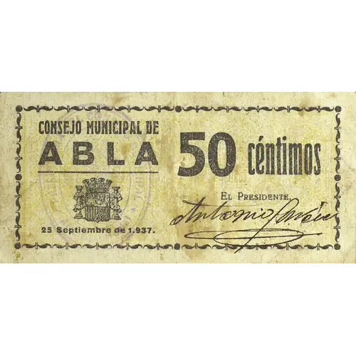 CONSEJO MUNICIPAL DE ABLA 50 céntimos 25 Septiembre de 1.937 (Translation: Municipal Council of Abla 50 Centimos September 25, 1937.) |