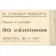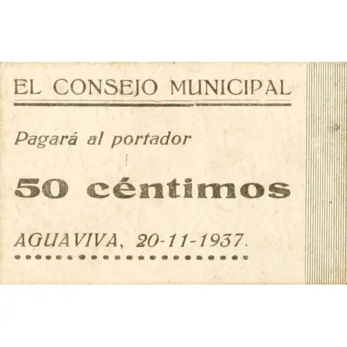 EL CONSEJO MUNICIPAL Pagará al portador 50 céntimos AGUAVIVA, 20-11-1937. (Translation: The Municipal Council Will pay the bearer 50 Centimos Aguaviva, November 20, 1937.) |