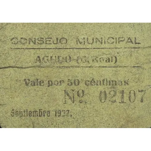 CONSEJO MUNICIPAL AGUDO (C. Real) Vale por 50 céntimos Septiembre 1937. (Translation: Municipal Council Agudo (Ciudad Real) Valid for 50 Centimos September 1937.) |