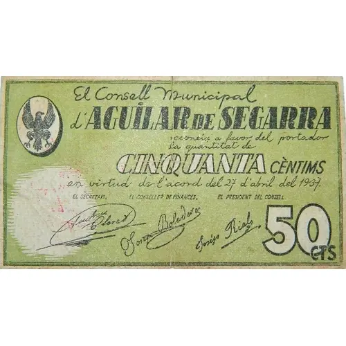 | Obverse lettering | El Consell Municipal d`AGUILAR DE SEGARRA reconeix a favor del portador la quantitat de CINQUANTA CÈNTIMS en virtud de l`acord del 27 d`abril del 1937 50 CTS (Translation: The Municipal Council of Aguilar de Segarra recognizes in favor of the bearer the amount of Fifty Centimos under the agreement of April 27, 1937 50 Centimos) |