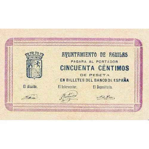 AYUNTAMIENTO DE AGUILAS PAGARA AL PORTADOR CINCUENTA CÉNTIMOS DE PESETA EN BILLETES DEL BANCO DE ESPAÑA (Translation: City Council of Aguilas Will pay the bearer Fifty Centimos of Peseta In banknotes of Bank of Spain) |