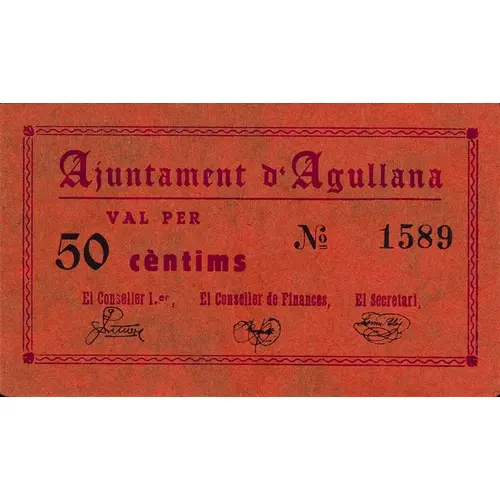 L`Ajuntament d`Agullana pagarà al portador CINQUANTA cèntims (Translation: The City Council of Agullana Will pay the bearer Fifty Centimos) |