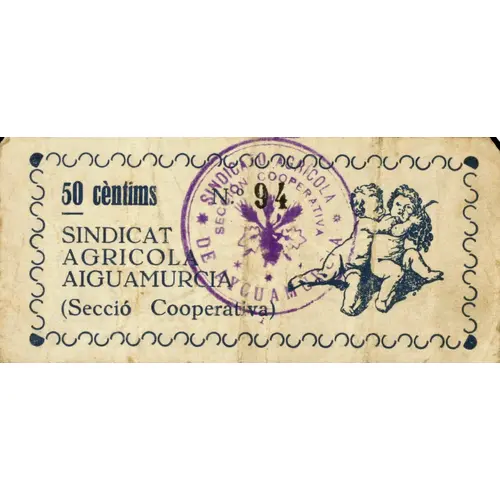 50 cèntims SINDICAT AGRICOLA AIGUAMURCIA (Secció Cooperativa) (Translation: 50 Centimos Agricultural Union Aiguamurcia Cooperative Section) |