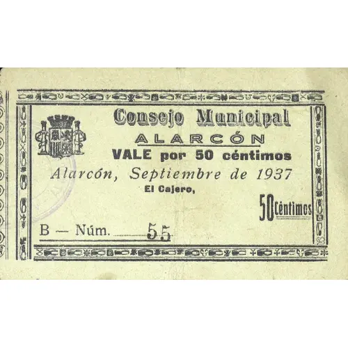 Consejo Municipal ALARCÓN VALE por 50 céntimos Alarcón, Septiembre de 1937 (Translation: Municipal Council Alarcón Voucher for 50 Centimos Alarcón, September of 1937) |