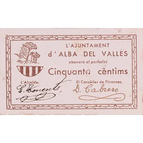 AJUNTAMENT d`ALBA DEL VALLÈS Any 1937 De curs legal en aquesta localitat VAL 50 CTS. (Translation: City Council of Alba del Vallès Year 1937 Legal tender in this location Voucher 50 Centimos) |
