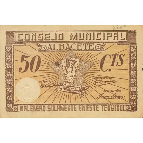 CONSEJO MUNICIPAL ALBACETE 50 CTS. VALEDERO SOLAMENTE EN ESTE TERMINO (Translation: Municipal Council Albacete 50 Centimos Valid only in this Term) |