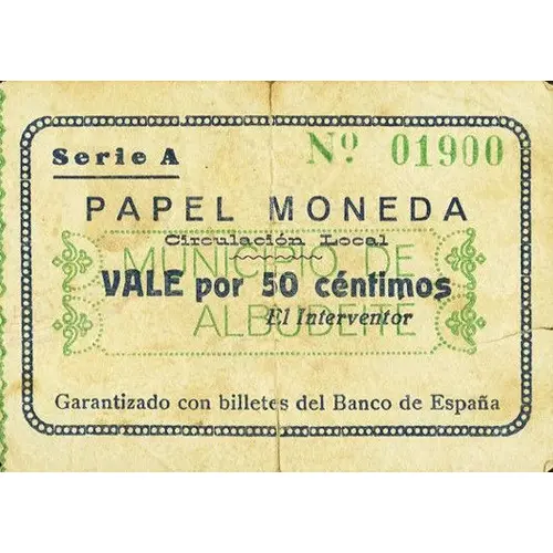 | نوشتههای روی اسکناس | PAPEL MONEDA Circulación Local MUNICIPIO DE ALBUDEITE VALE por 50 céntimos Garantizado con billetes del Banco de España (Translation: Paper Money Local circulation Municipality of Albudeite Voucher for 50 Centimos Guaranteed with banknotes from the Bank of Spain) |