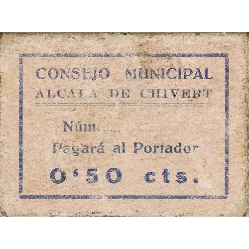 Obverse lettering CONSEJO MUNICIPAL ALCALA DE CHIVERT Pagará al Portador 0`50 cts.