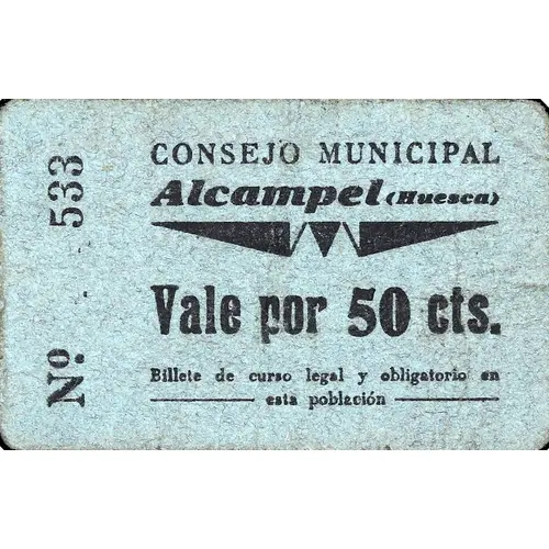 CONSEJO MUNICIPAL Alcampel (Huesca) Vale por 50 cts. Billete de curso legal y obligatorio en esta población (Translation: Municipal Council Alcampel (Huesca) Value 50 Centimos Legal and mandatory tender note in this town.) |