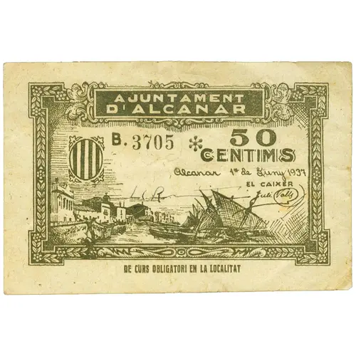 AJUNTAMENT D`ALCANAR 50 CENTIMS Alcanar 1er de Juny 1937 DE CURS OBLIGATORI EN LA LOCALITAT (Translation: City Council of Alcanar 50 Centimos Alcanar, June 1, 1937 Of mandatory course in the location) |