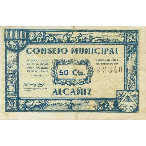 CONSEJO MUNICIPAL DE CURSO OBLIGADO EN LA LOCALIDAD Y CANJEABLE EN DEPOSITARIA 50 Cts. EMISIÓN DEL MES DE JUNIO DE 1937 ALCAÑIZ (Translation: Municipal Council Mandatory course in the locality and exchangeable in depositary 50 centimos Issue of the month of June 1937 Alcañiz) |
