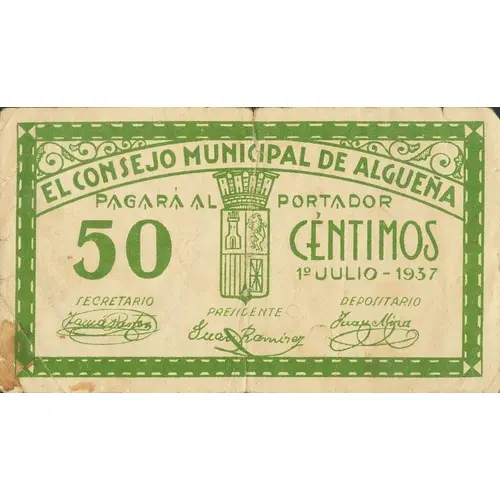 EL CONSEJO MUNICIPAL DE ALGUEÑA PAGARÁ AL PORTADOR 50 CÉNTIMOS 1º JULIO - 1937 (Translation: The Municipal Council of Algueña Will pay the bearer 50 Centimos 1st of July - 1937) |