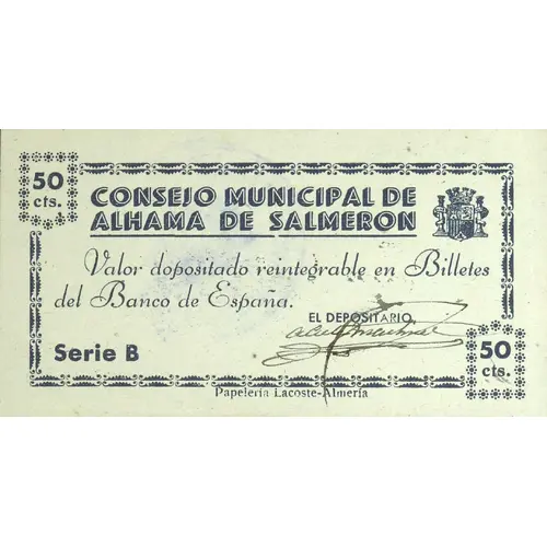 50 cts. CONSEJO MUNICIPAL DE ALHAMA DE SALMERON Valor depositado reintegrable en Billetes del Banco de España. SERIE B Papeleria Lacoste - Almeria (Translation: 50 Centimos Municipal Council of Alhama de Salmerón Amount deposited refundable in banknotes of the Bank of Spain. Series B) |