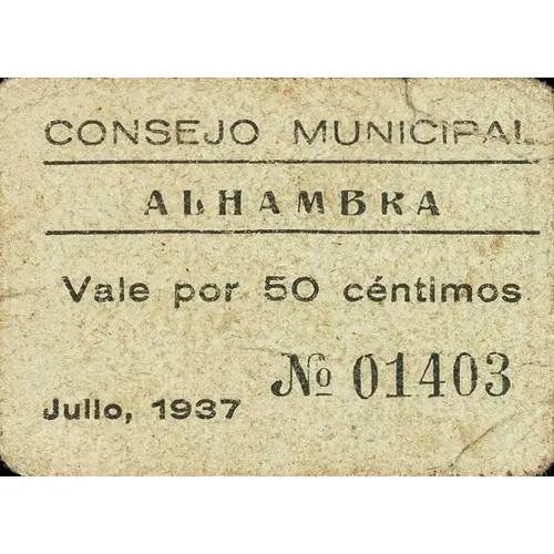 CONSEJO MUNICIPAL ALHAMBRA Vale por 50 céntimos Julio, 1937 (Translation: Municipal Council Alhambra Valid for 50 Centimos July, 1937) |