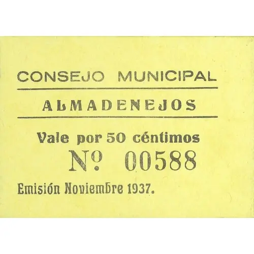 (Translation: Municipal Council Almadenejos Valid for 50 Centimos Issue November 1937.)