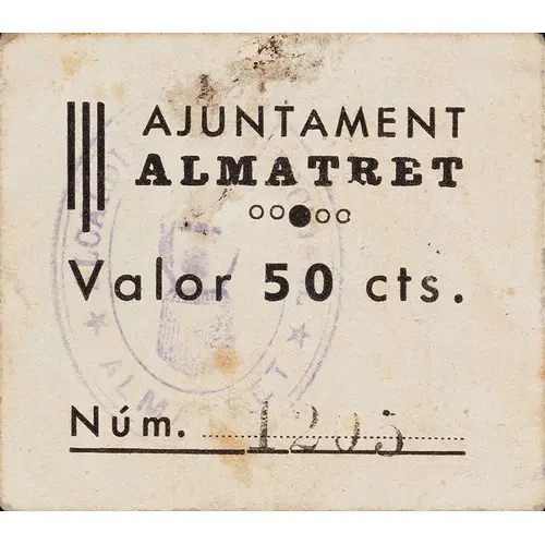 AJUNTAMENT ALMATRET Valor 50 cts. Núm. (Translation: City Council Almatret Value 50 Centimos Núm.) |