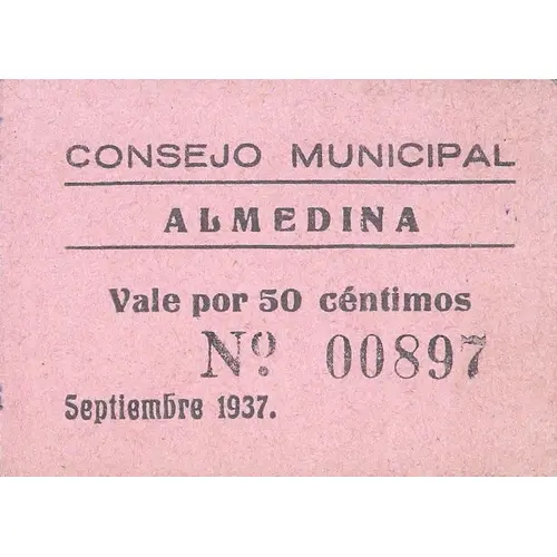 CONSEJO MUNICIPAL ALMEDINA Vale por 50 céntimos Septiembre 1937. (Translation: Municipal Council Almedina Valid for 50 Centimos September 1937.) |