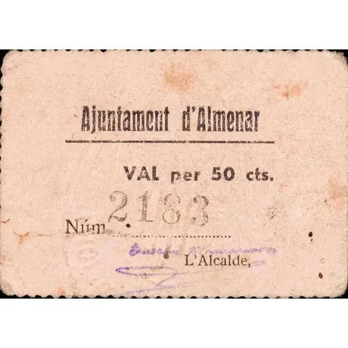 Ajuntament d`Almenar Val per 50 cts. (Translation: City Council of Almenar Voucher for 50 Centimos) |