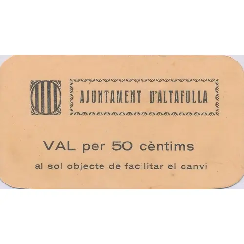 AJUNTAMENT D`ALTAFULLA VAL per 50 cèntims al sol objecte de facilitar el canvi (Translation: City Council of Altafulla Voucher for 50 Centimos for the sole purpose of facilitating change) |