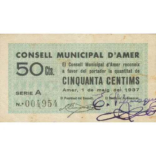 CONSELL MUNICIPAL D`AMER 50 Cts. El Consell Municipal d`Amer reconeix a favor del portador la quantitat de CINQUANTA CENTIMS Amer, 1 de maig del 1937 (Translation: Municipal Council of Amer 50 Centimos The Municipal Council of Amer recognizes in favor of the bearer the amount of Fifty Centimos Amer, May 1, 1937) |