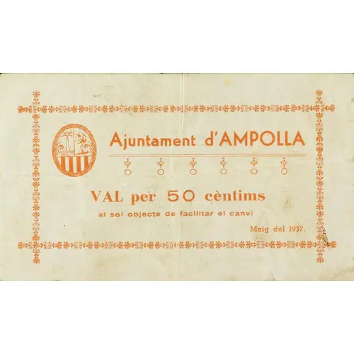 Ajuntament d`AMPOLLA VAL per 50 cèntims al sol objecte de facilitar el canvi Maig del 1937. (Translation: City Council of Ampolla Voucher for 50 Centimos with the sole purpose of facilitating change May 1937.) |