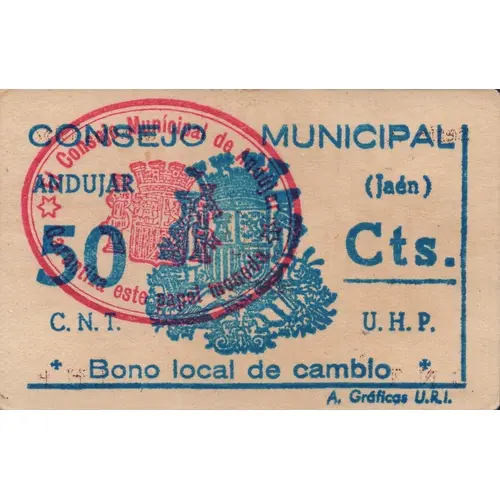 CONSEJO MUNICIPAL ANDUJAR (Jaén) 50 Cts. C. N. T. U. H. P. Bono local de cambio (Translation: Municipal Council Andújar (Jaén) 50 Centimos Local exchange bond) |