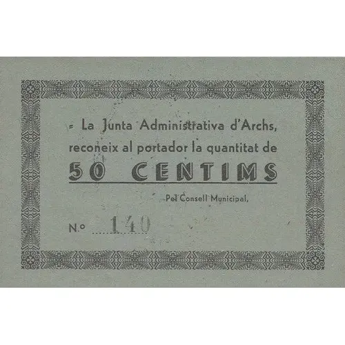 | Obverse lettering | La Junta Administrativa d`Archs, reconeix al portador la quantitat de 50 CENTIMS Pel Consell Municipal, (Translation: The Administrative Board of Archs, recognizes te bearer the amount of 50 Centimos For the Municipal Council,) |