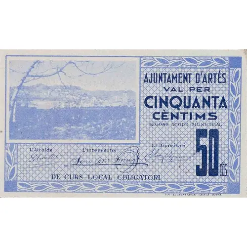 AJUNTAMENT D`ARTÉS 50 CÈNTIMS (Translation: City Council of Artés 50 Centimos) |