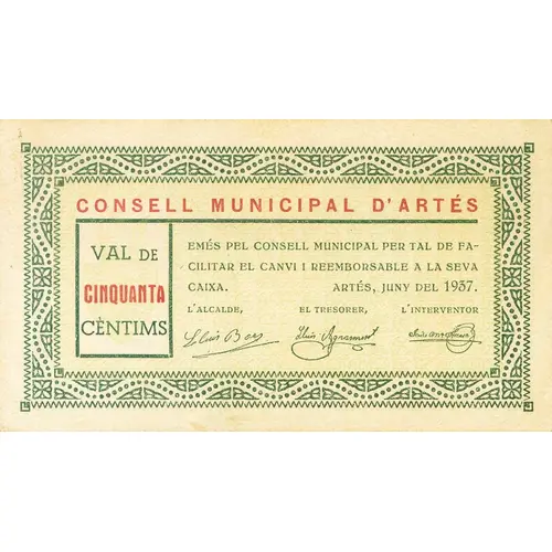CONSELL MUNICIPAL D`ARTÈS VAL DE CINQUANTA CÈNTIMS EMÉS PEL CONSELL MUNICIPAL PER TAL DE FACILITAR EL CANVI I REEMBORSABLE A LA SEVA CAIXA. ARTÉS, JUNY DEL 1937. (Translation: Municipal Council of Artés Voucher of Fifty Centimos Issued by the Municipal Council in order to facilitate the exchange and refundable in his found. Artés, June 1937.) |