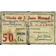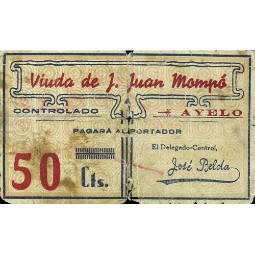 Viuda de J. Juan Mompó CONTROLADO AYELO PAGARÁ AL PORTADOR 50 Cts. (Translation: Widow of J. Juan Mompó Controlled Ayelo Will pay the bearer 50 Centimos) |