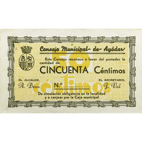 Consejo Municipal de Ayódar Este Consejo reconoce a favor del portador la cantidad de CINCUENTA Céntimos De circulación obligatoria en la localidad y a canjear en la Caja municipal (Translation: Municipal Council of Ayódar This Council recognizes in favor of the bearer the amount of Fifty Centimos Mandatory circulation in the town and to be exchanged at the Municipal Fund) |