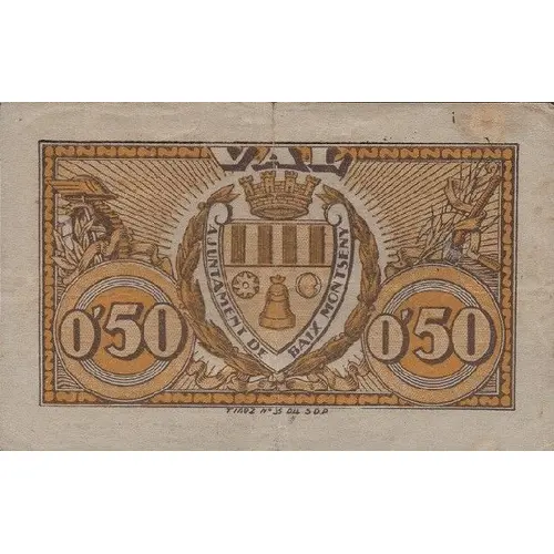 VAL 50 centims La circulació d`aquest bitllet obeeix a diverses peticions formulades per veïns d`aquesta localitat per tal de facilitar els canvis. (Translation: Voucher 0.50 Centimos The circulation of this banknote is due to various requests made by residents of this town in order to facilitate the changes.) |