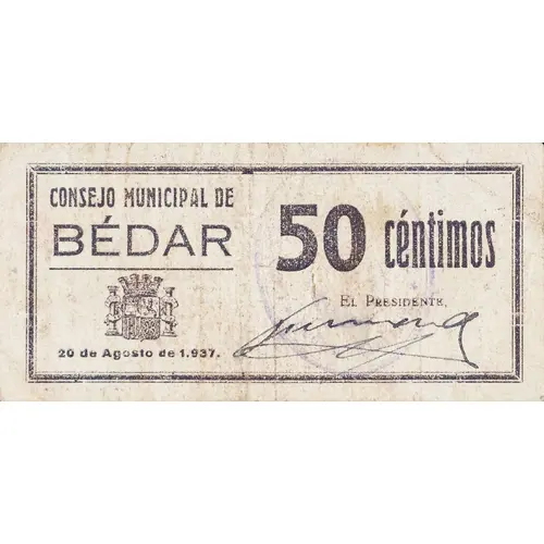 CONSEJO MUNICIPAL DE BÉDAR 50 céntimos 20 de Agosto de 1.937 (Translation: Municipal Council of Bédar 50 Centimos August 20, 1937.) |