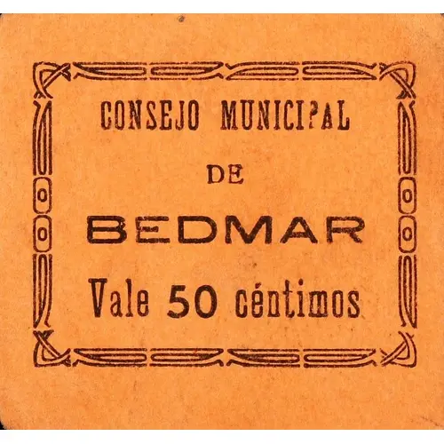 CONSEJO MUNICIPAL DE BEDMAR Vale 50 céntimos (Translation: Municipal Council of Bedmar It is worth 50 Centimos) |