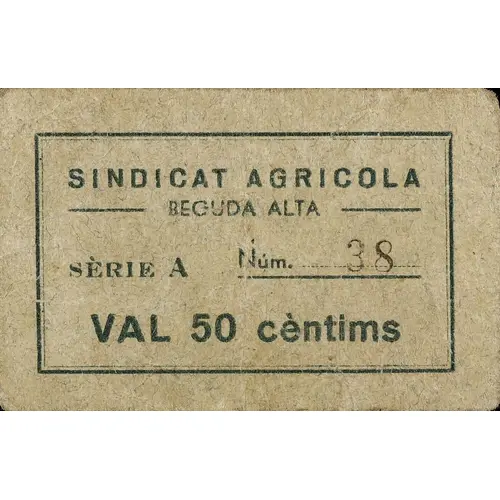 | Obverse lettering | SINDICAT AGRICOLA BEGUDA ALTA SÈRIE A Núm. 38 VAL 50 cèntims (Translation: Agricultural Union It`s worth 50 Centimos) |