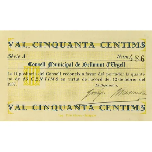 VAL CINQUANTA CENTIMS Consell Municipal de Bellmunt d`Urgell La Dipositoria del Consell reconeix a favor del portador la quantitat de 50 CENTIMS en virtut de l`acord del 12 de febrer del 1937. VAL CINQUANTA CENTIMS (Translation: It`s worth Fifty centimos Municipal Council of Bellmunt d`Urgell The Depository of the Council recognizes in favor of the bearer the amount of 50 Centimos by virtue of the agreement of February 12, 1937. It`s worth Fifty centimos) |
