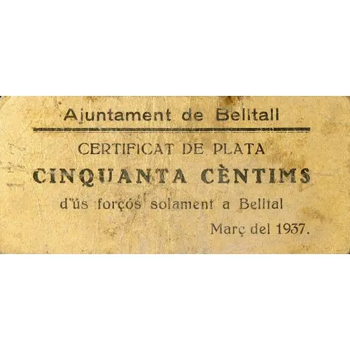 Ajuntament de Belltall CERTIFICAT DE PLATA CINQUANTA CÈNTIMS d`ús forçós solament a Belltall Març del 1937. (Translation: City Council of Belltall Silver Certificate Fifty Centimos of mandatory use only in Belltall March of 1937.) |