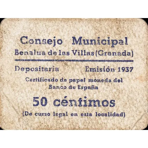 | Obverse lettering | Consejo Municipal Benalúa de las Villas (Granada) Depositaría Emisión 1937 Certificado de papel moneda del Banco de España 50 céntimos (De curso legal en esta localidad) (Translation: Municipal Council Benalúa de las Villas (Granada) Depositary Issue 1937 Bank of Spain paper money certificate 50 Centimos (Legal tender in this location)) |