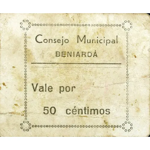 Consejo Municipal BENIARDÁ Vale por 50 céntimos (Translation: Municipal Council Beniardá Valid for 50 Centimos) |