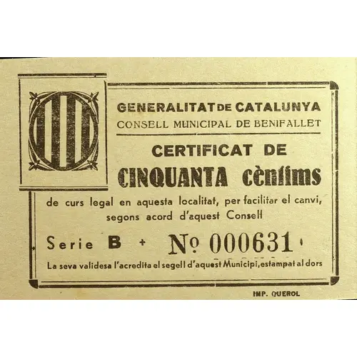 GENERALITAT DE CATALUNYA CONSELL MUNICIPAL DE BENIFALLET CERTIFICAT DE CINQUANTA cèntims de curs legal en aquesta localitat, per facilitar el canvi, segons acord d`aquest Consell La validesa l`acredita el segell d`aquest Municipi, estampat al dors. (Translation: Generalitat of Catalonia Municipal Council of Benifallet Certificate of Fifty Centimos of legal tender in this locality, to facilitate the change, according to the agreement of this Council Validity is certified by the seal of this Municipality, stamped on the back.) |
