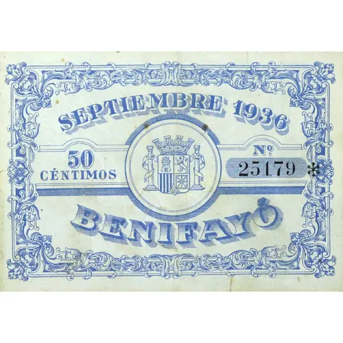 | Obverse lettering | SEPTIEMBRE 1936 50 CÉNTIMOS BENIFAYÓ (Translation: September 1936 50 Centimos Benifayó) |