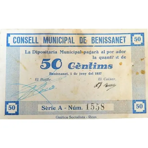 50 CONSELL MUNICIPAL DE BENISSANET La Dipositaria Municipal pagarà al portador la quantitat de 50 Cèntims Benissanet, 1 de juny del 1937 (Translation: Municipal Council of Benissanet The Municipal Depository will pay the bearer the amount of 50 Centimos Benissanet, June 1, 1937) |