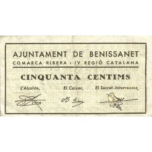 CONSELL MUNICIPAL DE BENISSANET 50 CENTIMS Bitllet de circulació obligatòria a tota la jurisdicció municipal. Emissió segons acord del 31 juliol 1937 (Translation: Municipal Council of Benissanet 50 Centimos Mandatory circulation banknote throughout the municipal jurisdiction. Issue under agreement of July 31, 1937) |