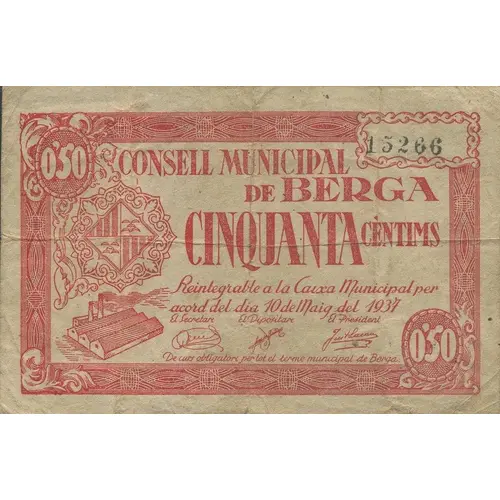 0`50 CONSELL MUNICIPAL DE BERGA CINQUANTA CÈNTIMS Reintegrable a la Caixa Municipal per acord del dia 10 de Maig del 1937 De curs obligatori per tot el terme municipal de Berga (Translation: Municipal Council of Berga Fifty Centimos Refundable to the Municipal Treasury by agreement of May 10, 1937 Of mandatory course throughout the municipality of Berga) |