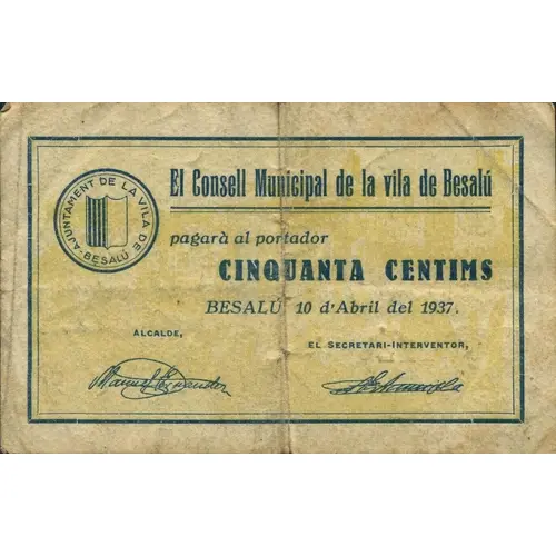 El Consell Municipal de la vila de Besalú pagarà al portador CINQUANTA CENTIMS BESALÚ 10 d`Abril del 1937. (Translation: The Municipal Council of the town of Besalú will pay the bearer Fifty Centimos Besalú, April 10, 1937.) |
