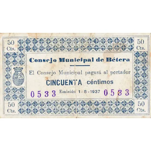 50 Cts. Consejo Municipal de Bétera El Consejo Municipal pagará al portador CINCUENTA céntimos Emisión 1-8-1937 (Translation: 50 Centimos Municipal Council of Bétera The Municipal Council will pay the bearer Fifty Centimos Issue August 1, 1937) |
